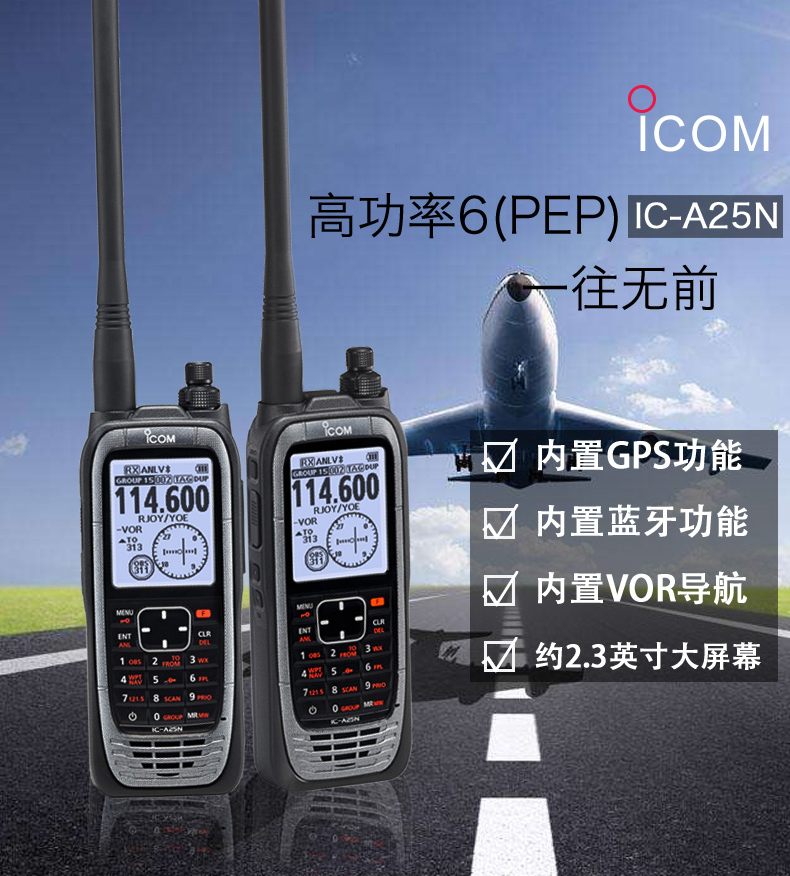 拿着IC-A25N首先感觉到它的厚重和结实耐用。主机前面板2.3英寸大显示屏和导航式按键相呼应,加上2350mAh的扁平电池设计使得整机线条流畅,布局合理,厚薄适中很有点大器晚成之感。 右侧底部的11VDV电源插口既可以配合CP-20选件实现车载DC11V实现外部电源供电工作又可通过BP-167S适配器通过主机直接为电池充电,为电池充电实现了双备份。