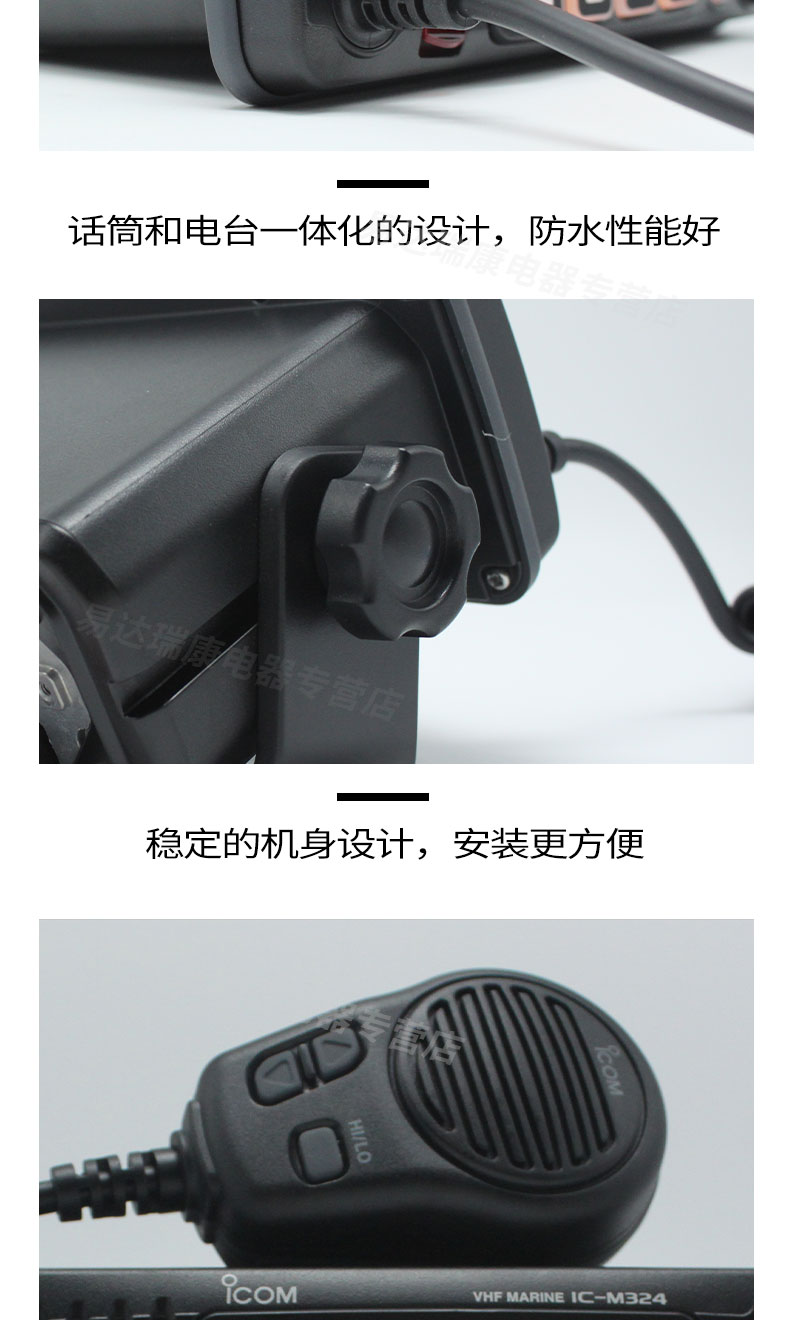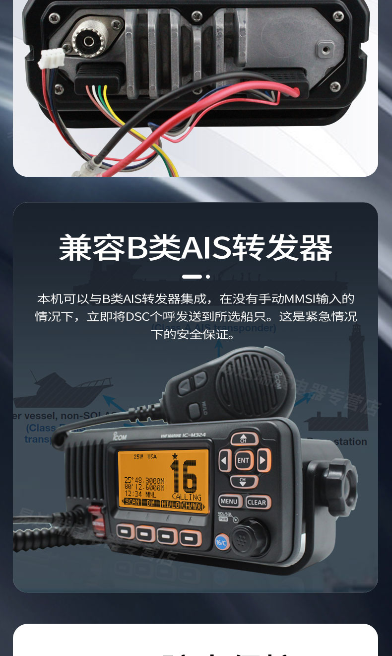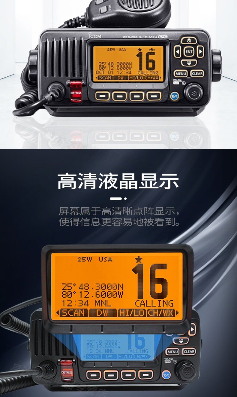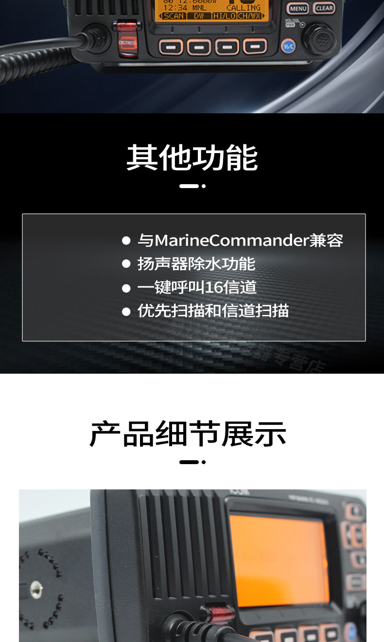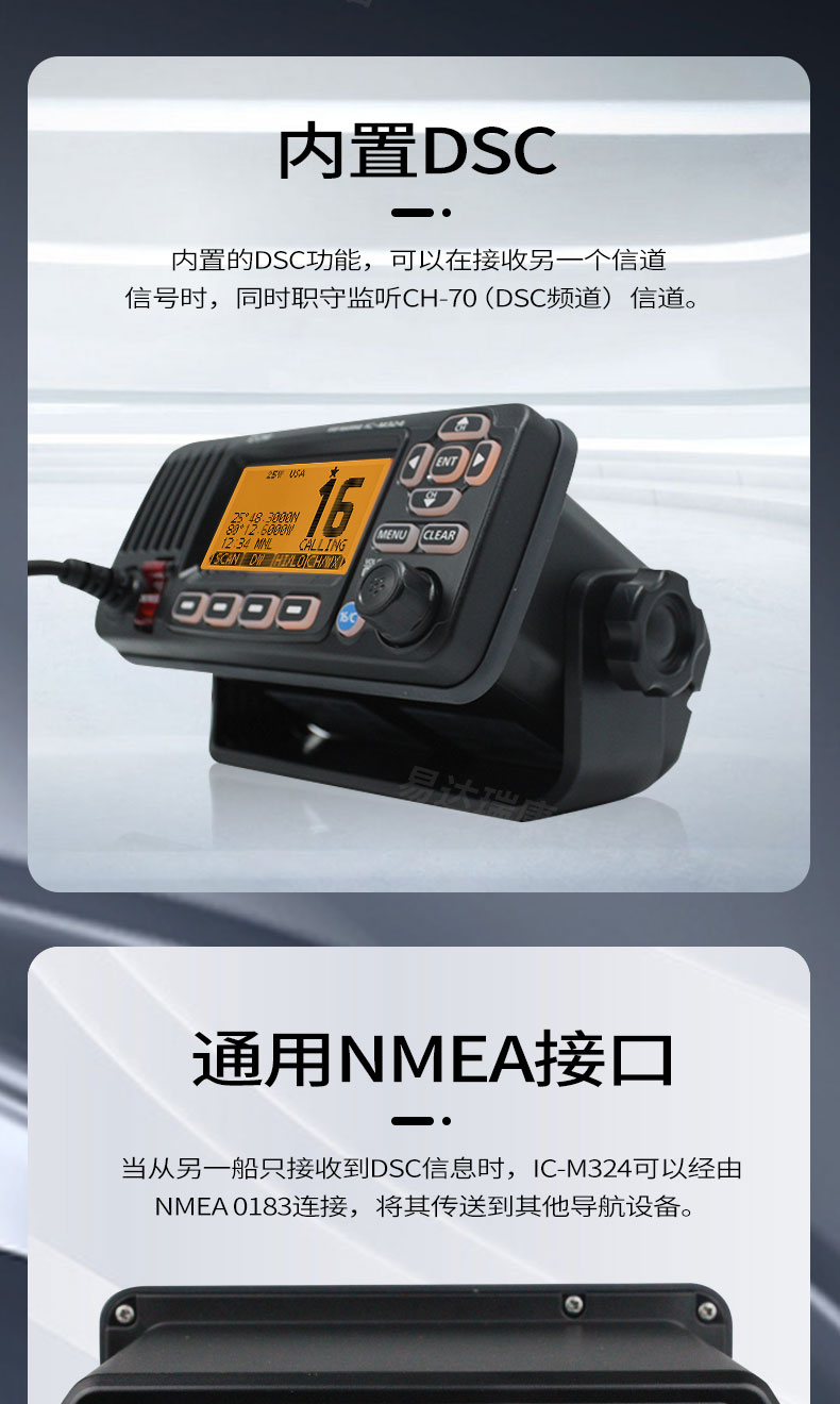 • 海事甚高频电台,内置通用海事频点。DSC功能,在遇险是及时发出紧急求救信号。