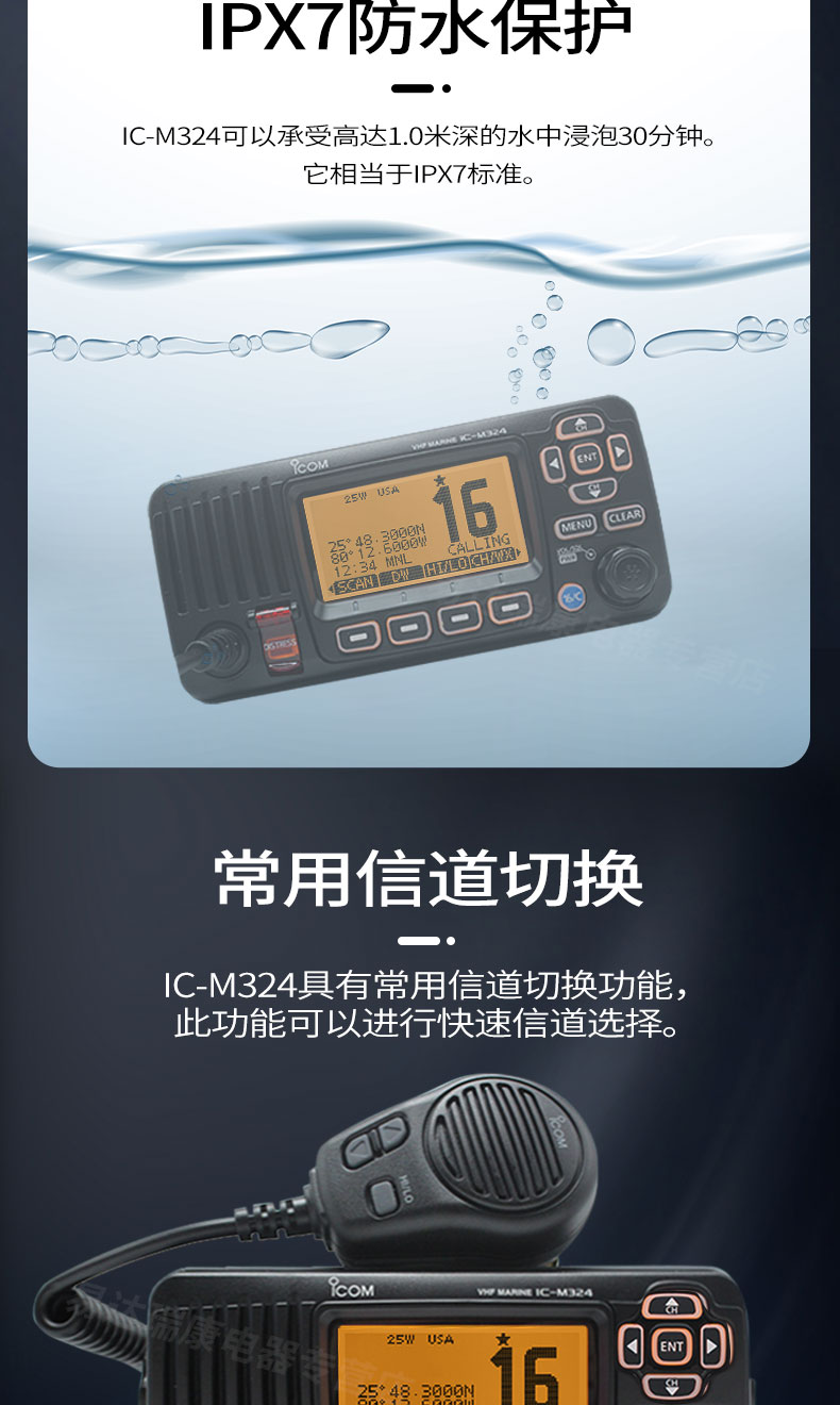 IC-M324 可以承受高达1.0米深的水中浸泡30分钟。它相当于IPX7标准防护.