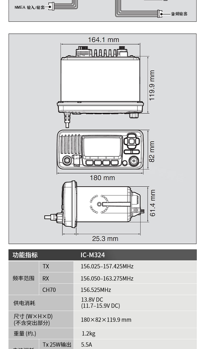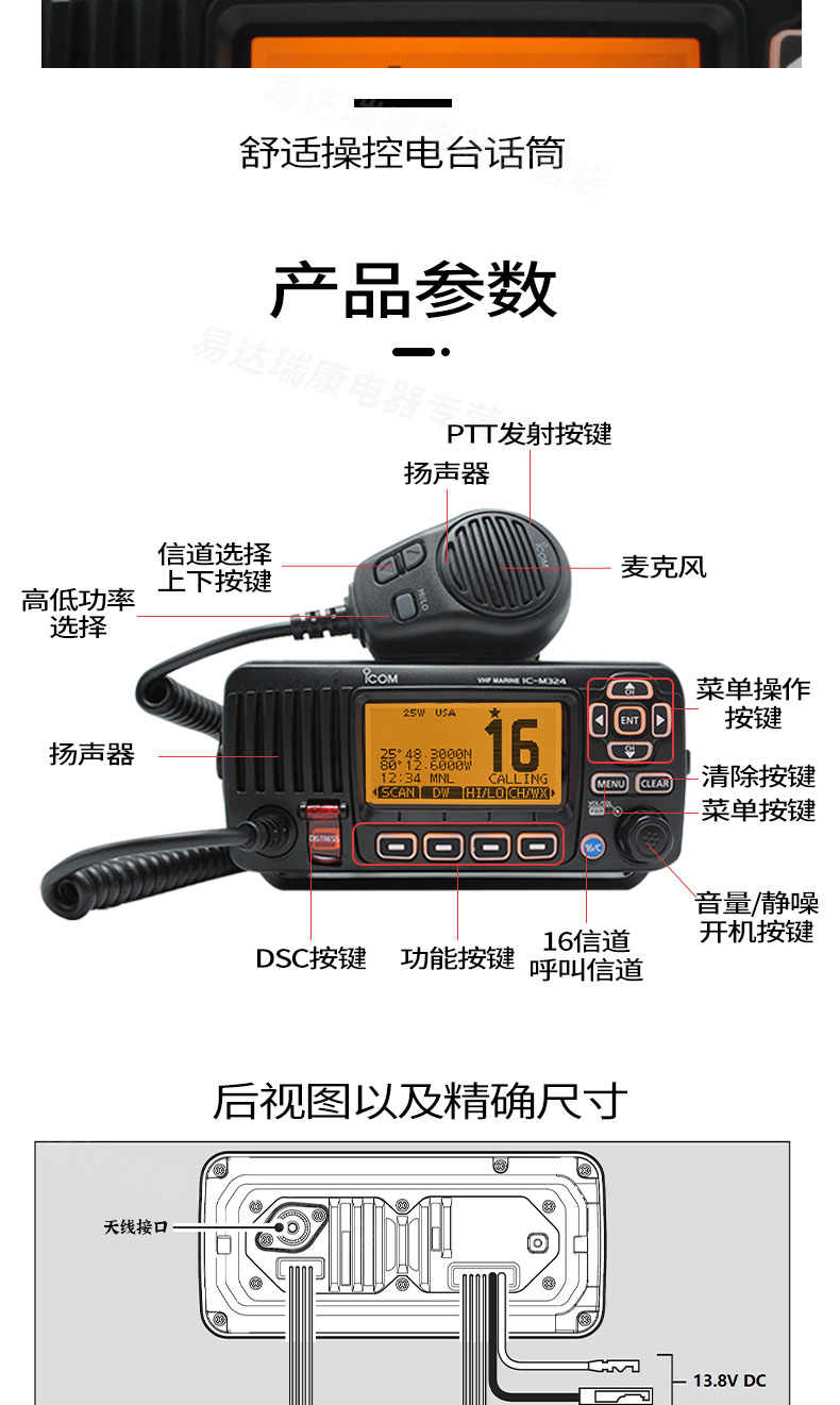 海事甚高频电台,内置通用海事频点。DSC功能,在遇险是及时发出紧急求救信号。一键16信道紧急呼叫。CMIIT 核准证代码CMIIT ID: 2016FJ1269